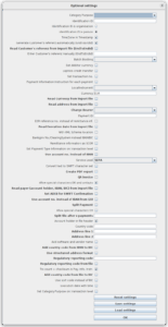 (Direct debit type (ERST, FOLGE, EINMAL, LETZT) (Direct debit kind (CORE, COR1, B2B) (Category Purpose (only values from selectbox allowed) (Identification ID) (true/false: Identification ID is person) (true/false: Identification ID is organisation) (true/false: TimeZone in Timestamp) (true/false: Generate Customer's referenz automatically (EndToEndId)) (Customer's referenz (EndToEndId)) (Batch Booking (EMPTY, YES, NO)) (true/false: Set transaction no.) (true/false: Payment Information Instruction for each payment) (Currency) (ChargeBearer (EMPTY, CRED, DEBT, SHAR, SLEV) (Payment ID) (true/false: XML header with Schema Location) (Split file after x payments) (true/false: Add software name and vendor) (Country code) (Address line 1) (Address line 2) (true:/false Use structured address format)