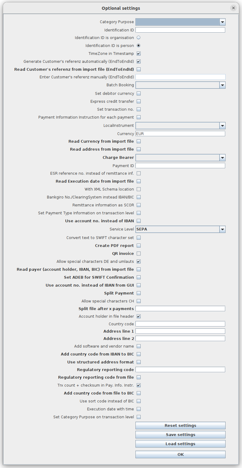 (Category Purpose (only values from selectbox allowed)) (Identification ID) (true/false: Identification ID is person) (true/false: Identification ID is organisation) (true/false: TimeZone in Timestamp) (true/false: Generate Customer's referenz automatically (EndToEndId)) (Customer's referenz (EndToEndId)) (Batch Booking (EMPTY, YES, NO)) (true/false: Set debitor currency (true/false: express credit transfer (CCU/DTE)) (true/false: Set transaction no.) (true/false: Payment Information Instruction for each payment) (LocalInstrument (only values from selectbox allowed)) (Currency) (ChargeBearer (EMPTY, CRED, DEBT, SHAR, SLEV)) (Payment ID) (true/false: use ESR reference no.) (true/false: XML header with Schema Location) (true/false: Remittance information as SCOR) (true/false: Payment Type Information on transaction level) (Service Level (only values from selectbox allowed)) (true/false: create PDF report) (true/false: SWIFT confirmation) (Country code) (Split file after x payments) (true/false: Account holder in file header) (Address line 1) (Address line 2) (true/false: Add software name and vendor) (true/false: Country code from IBAN to BIC) (true:/false Use structured address format) (Regulatory reporting code) (true/false: Transaction count and checksum in Payment Information Instruction) (true/false: Country code from file to BIC) (true/false: Category Purpose on transaction level)